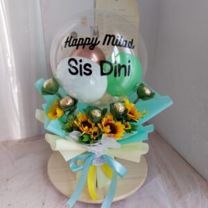 Buket bunga artifisial dengan penambahan balon yang bisa sekaligus dikasih ucapan.