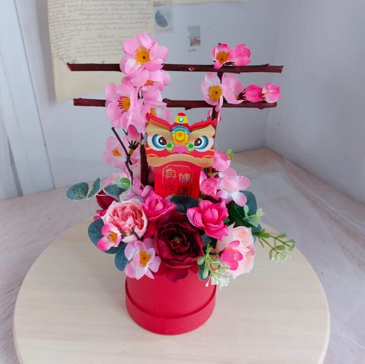 mini bloom box bunga artificial untuk dekorasi imlek, bisa untuk hampers atau gift, ada amplop angpao barongsai ditengahnya