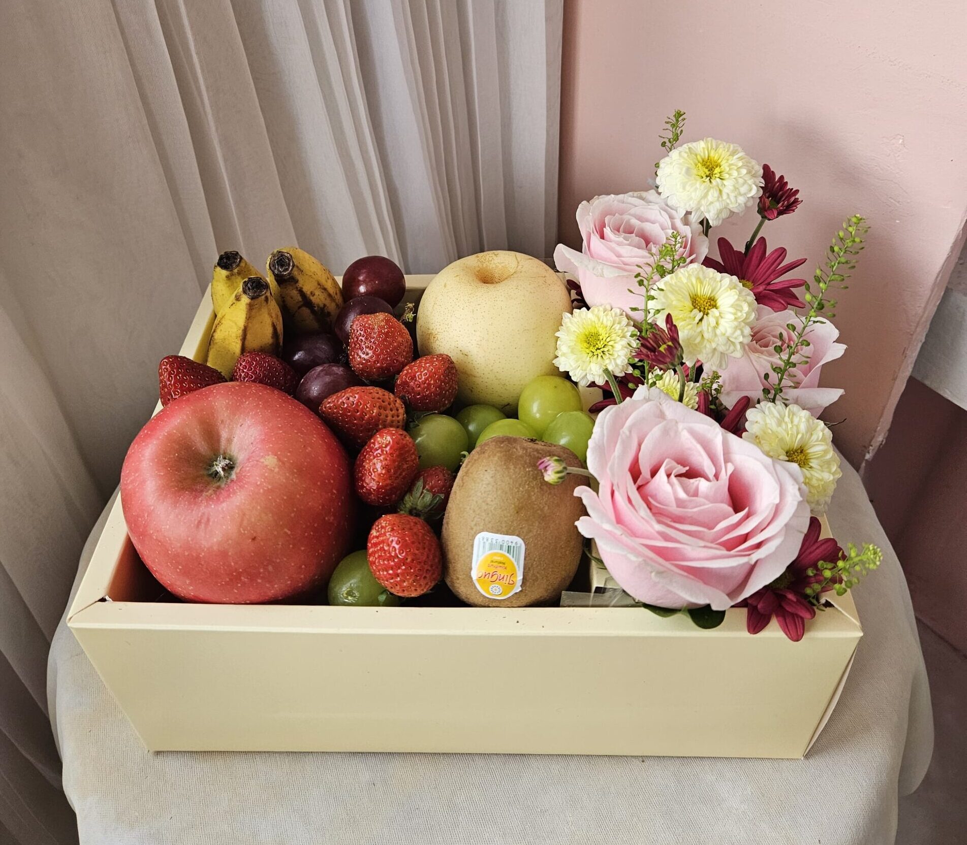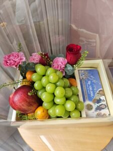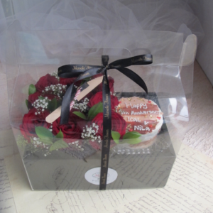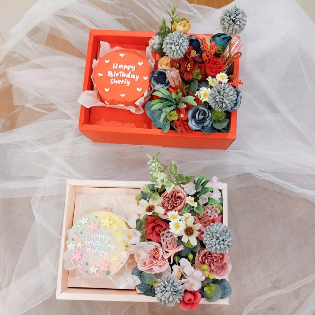 bunga dalam box yang bisa dijinjing. Bisa diisi bento cake atau uang. Tersedia pilihan bunga artificial atau fresh terdapat 4 variasi :