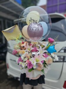 Rose pink,Rose putih, gompie pink,Lily putih, Carnation, Cinerea, Ruskus,Talasphy teddy bear balon foil