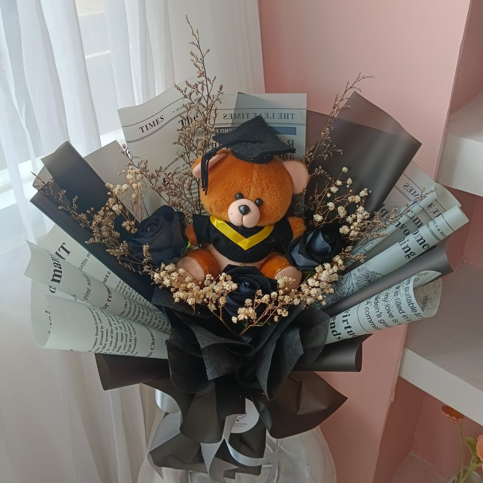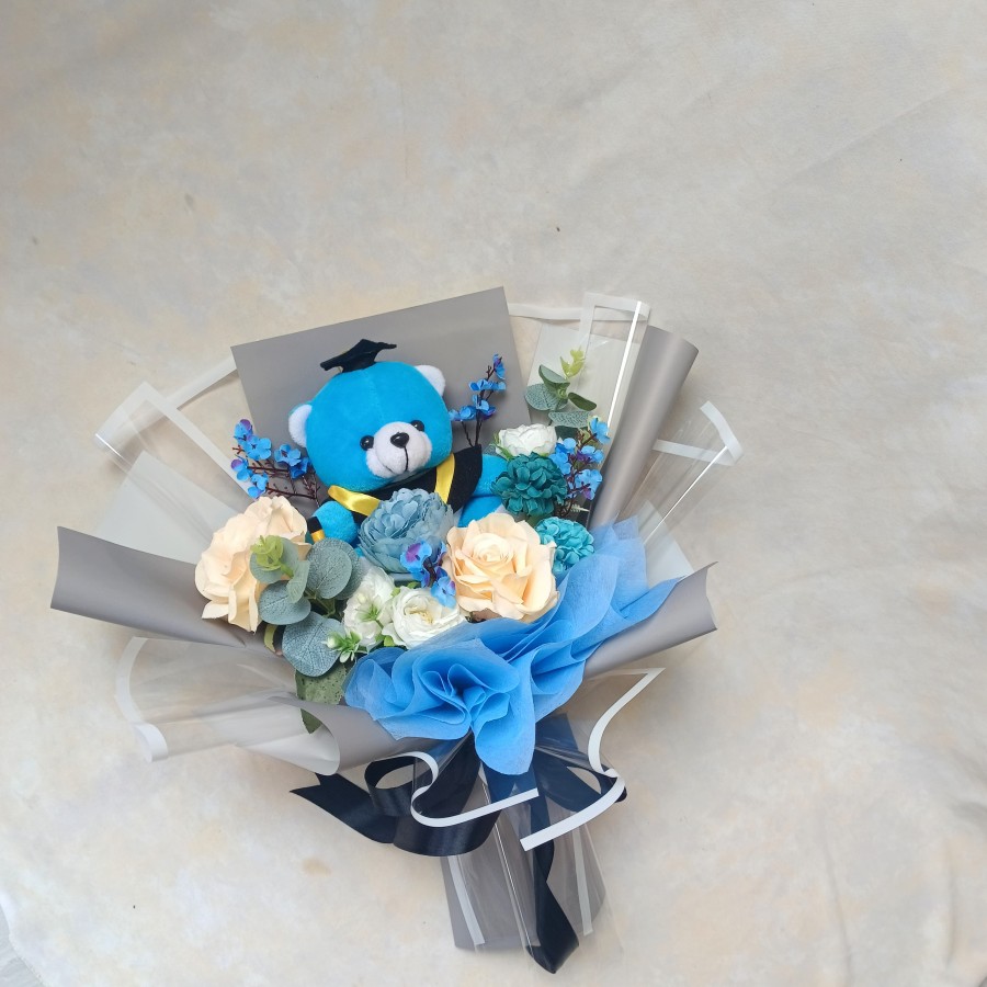 Buket bunga boneka wisuda artifisial/ palsu/imitasi sehingga awet disimpan. Terdapat banyak pilihan warna.