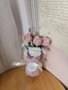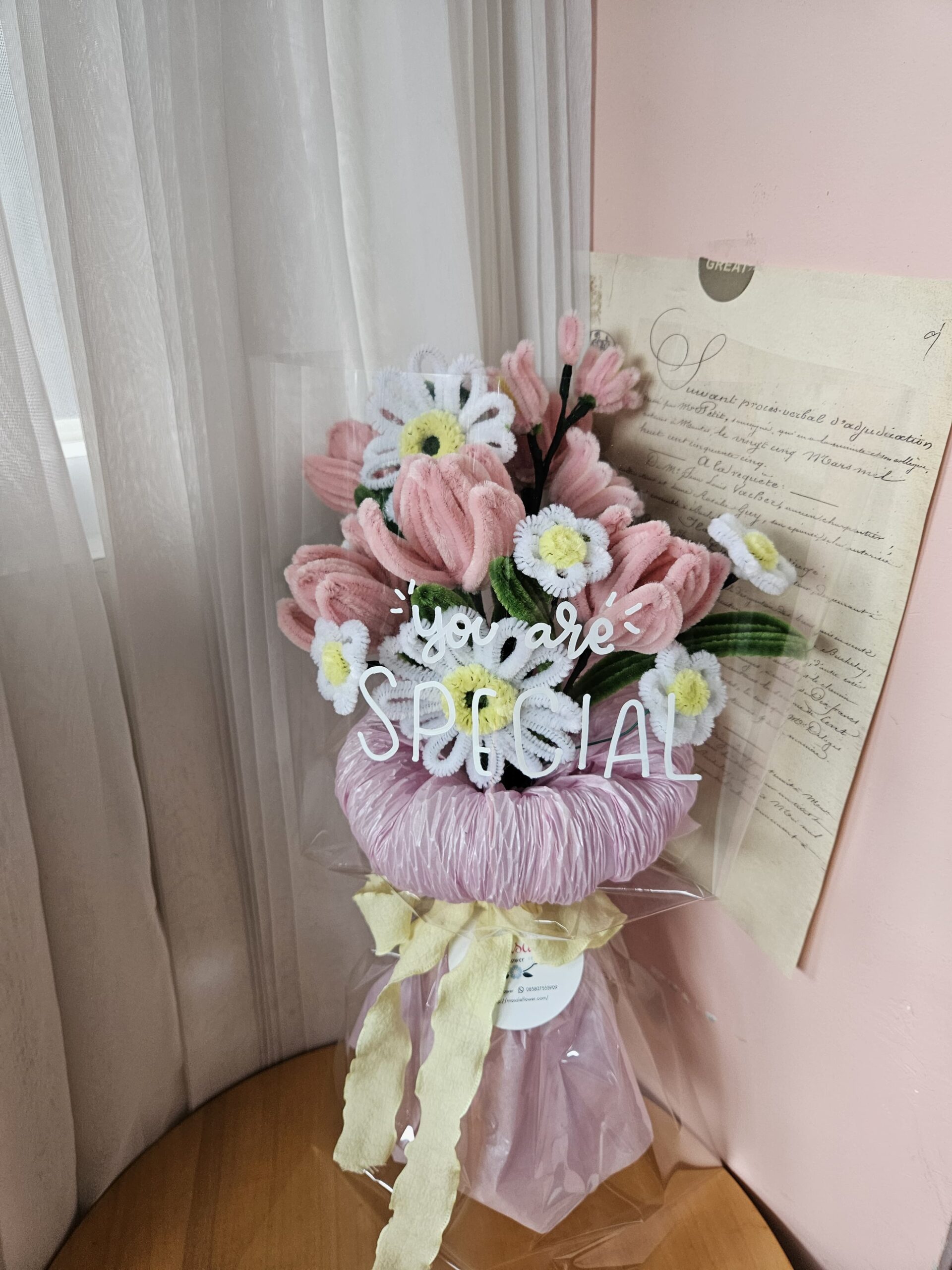 seluruh produk di etalase adalah handmade. Tidak akan 100% sama dengan produk yang sudah dibuat meskipun material dan perangkai sama. Bila ada bunga yang habis kami akan tukar dengan bunga yang mirip-mirip baik bentuk atau warna namun akan tetap dibuat sama cantik.