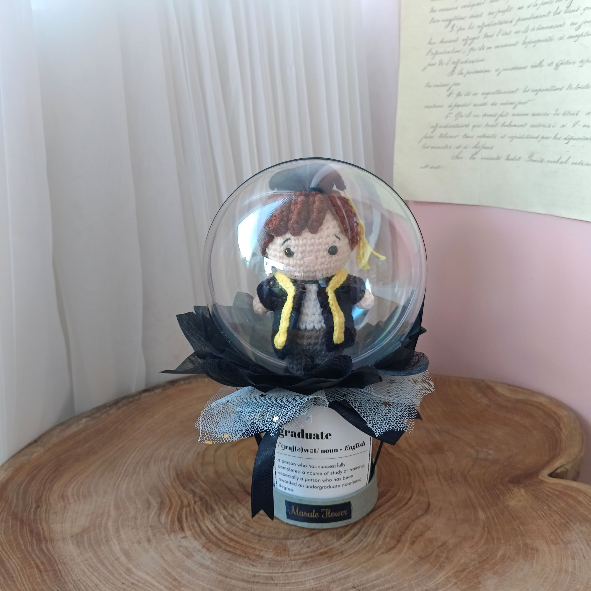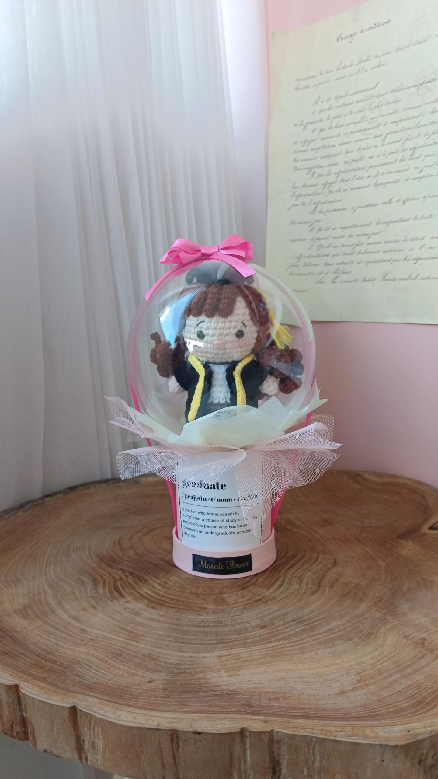 buket bunga balon menggunakan pot sehingga dapat berdiri. Bisa request tulisan pada balon. Cocok untuk kado wisuda. terdapat boneka rajut amigurumi.